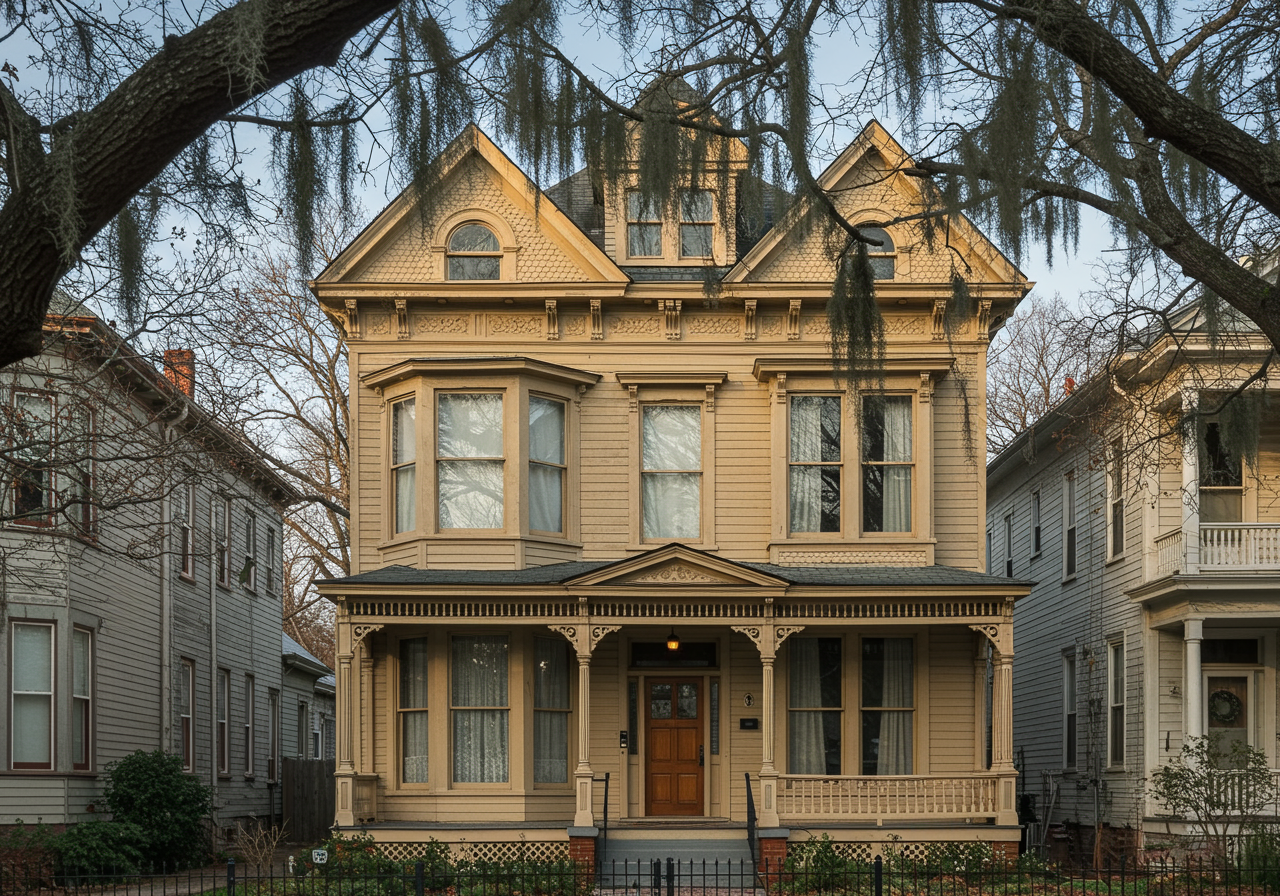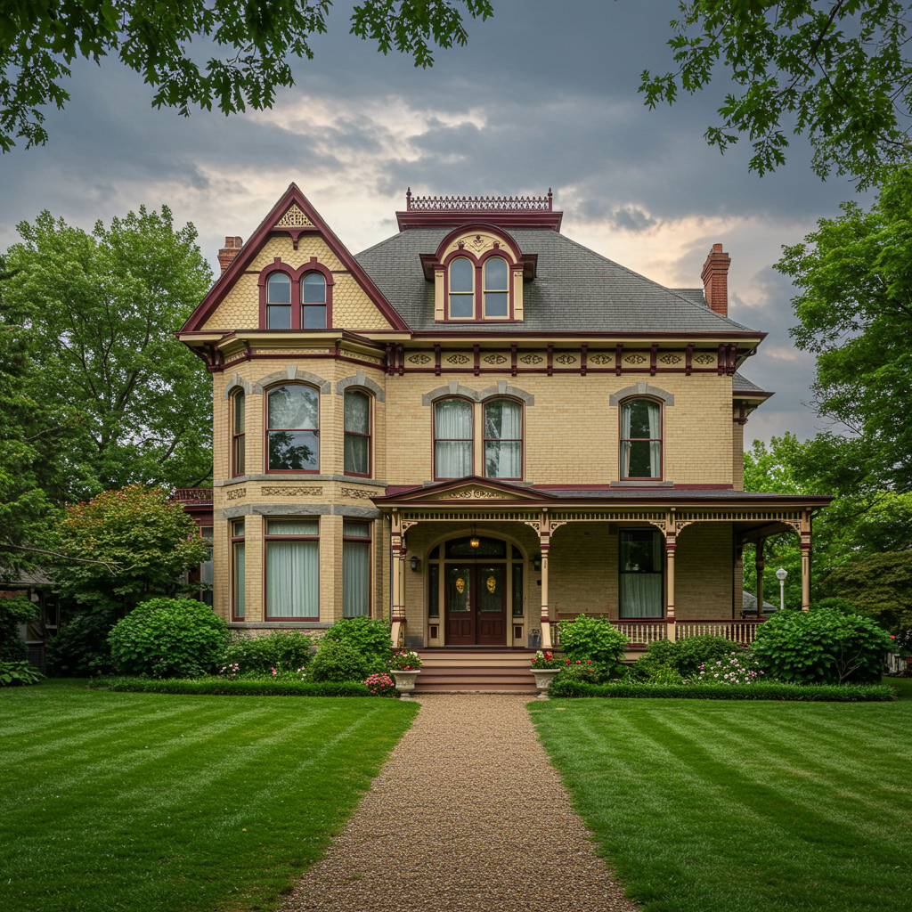 With steep roofs and unique facades, the Queen Anne style makes an impressive statement. This is an asymmetrical style of architecture from the Victorian period. These homes are simply splendid, emphasizing decorative details that make them stand out. Scalloped and painted shingles, turrets, expansive and decoratively shaped windows, and wrapping porches with ornate railings are examples of some of the lovely details that make this architectural type special. Queen Anne architecture was a return to a picturesque view of reality that inspired daydreaming and frivolity.